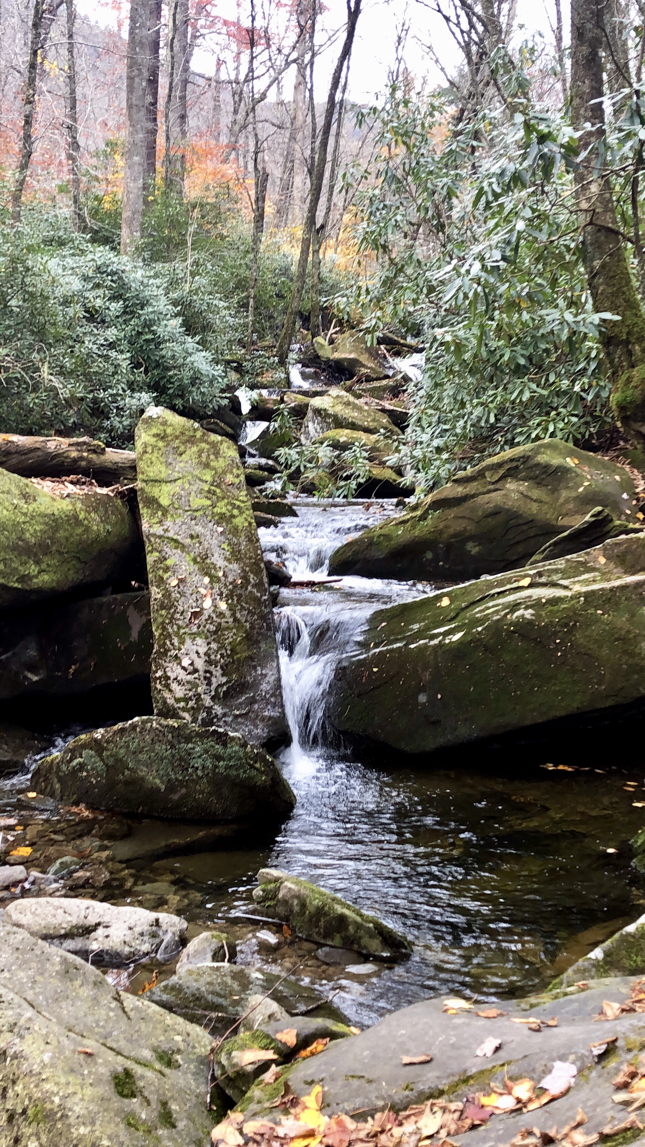 Ramsay Cascade Falls is around 8 miles round trip with about 2200 ft elevation gain. This hike is to the tallest waterfall in the park, and is considered strenuous. The trail takes you through a dense forest, along streams/rivers, across a bridge, and scrambling up some big rocks near the end. The nice part about visiting in late fall was that we nearly had the trail to ourselves, maybe crossing paths with a dozen people our whole hike. The fall colors were past peak, but they were holding on and oh so beautiful!