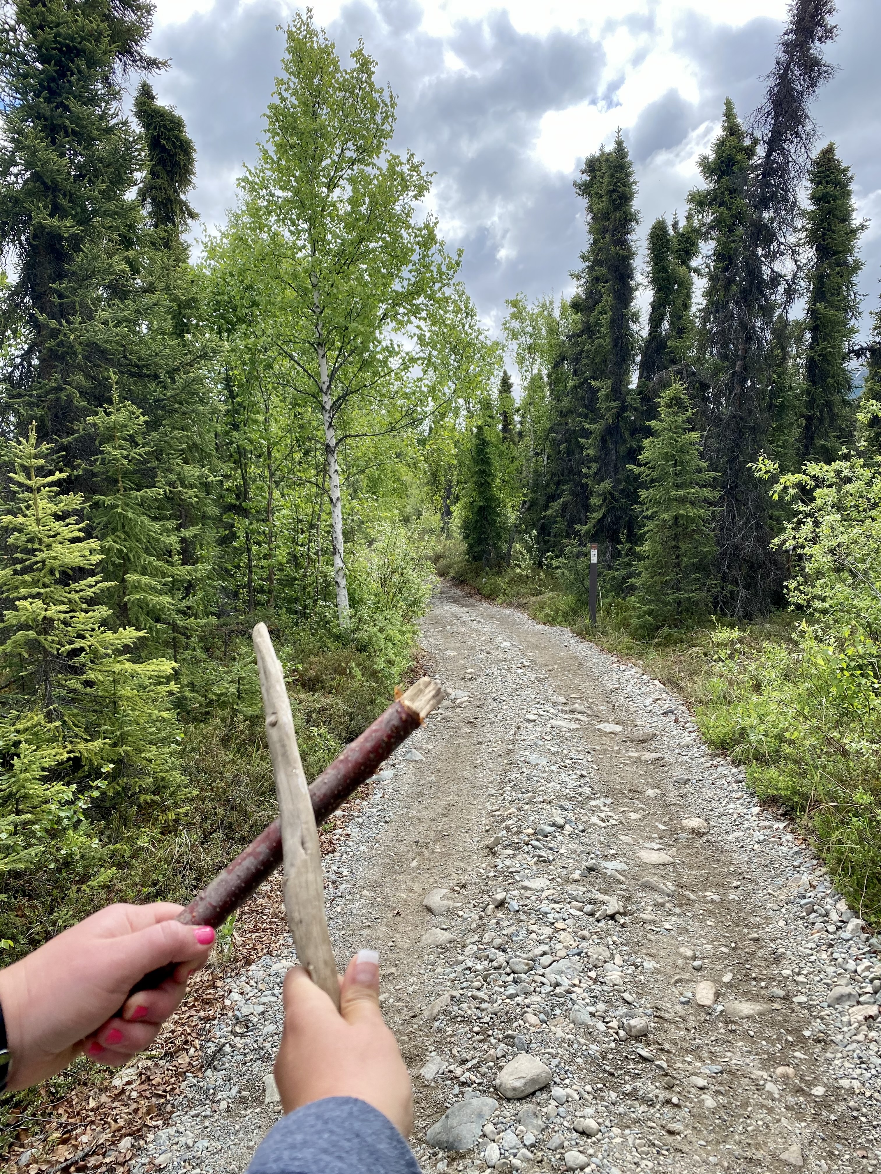 The main activity we had planned for our day was to hike to Tanalian Falls. It was also recommended by some new friends we met on our flight from Anchorage that we hike past the falls to Kontrashibuna Lake. I’m not going to lie, we were a little (lot) nervous to do some solo hiking (because, bears) but, at the same time, we didn’t want to miss the opportunity for an amazing hike in this rugged national park. So, we put on our big girl hiking pants, rented some bear spray from the lodge, left our food behind, and were on our merry way. We signed a hiker’s registry at the beginning of our hike, so at least if we got eaten by a bear, someone would have a ballpark idea of when it happened 😉. We were alone for the majority of our hike in- no bears were seen, but the scat was plentiful. We sang most of the way (Disney songs, of course) and found some sticks to beat together loudly and against trees.
