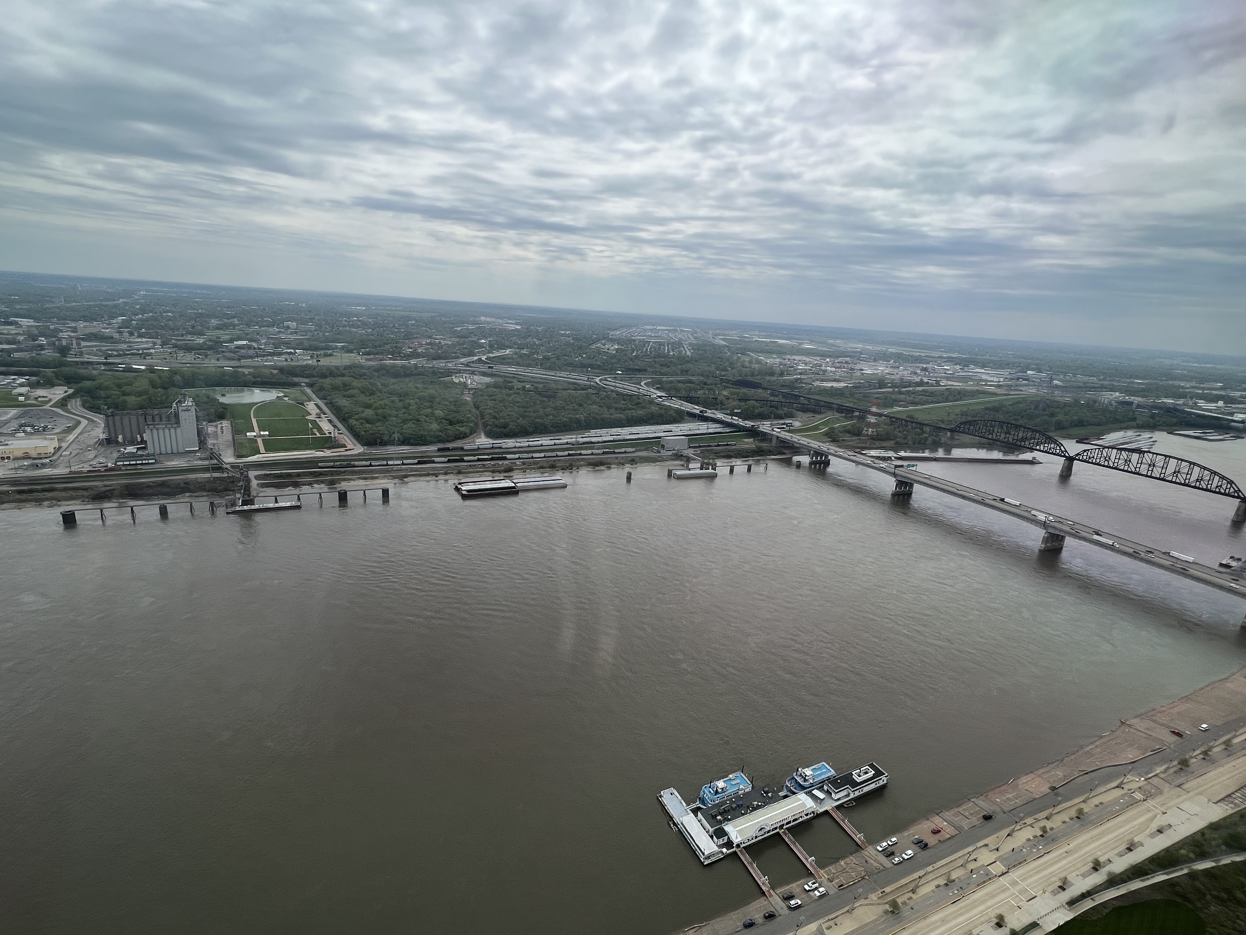 While visiting, we took a tram ride to the top. We learned that an elevator, escalator, and Ferris wheel were all considerations to build to get people to the top. The tram ride takes about 4 minutes up, and 3 minutes back down. Each group is allotted 10 minutes at the top for pictures and views. It’s a little eerie at the top, but the Gateway Arch is designed to withstand earthquakes and lightning strikes, and is built to sway up to 18 inches in 150 mph winds, so it’s a sturdy structure.