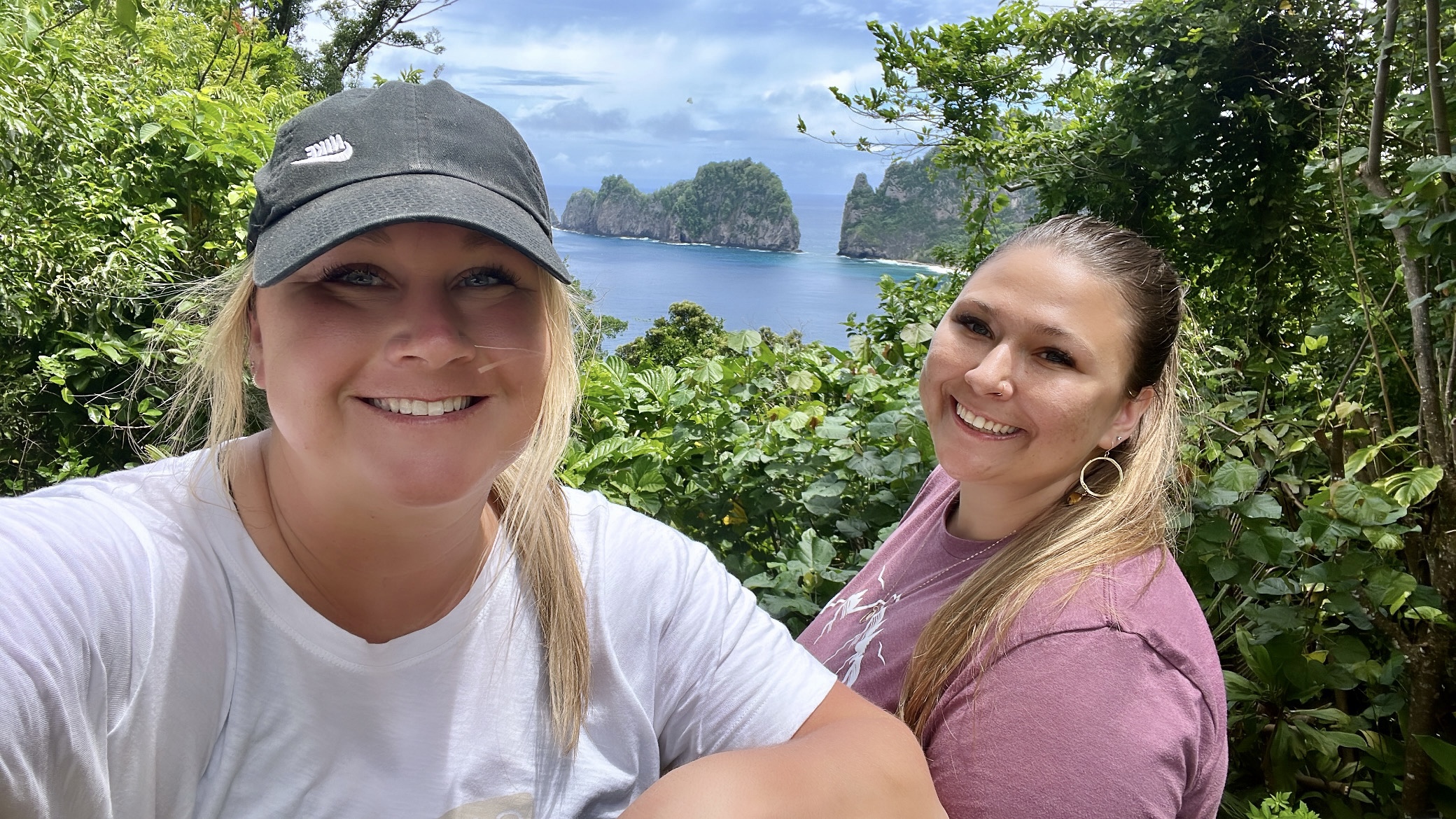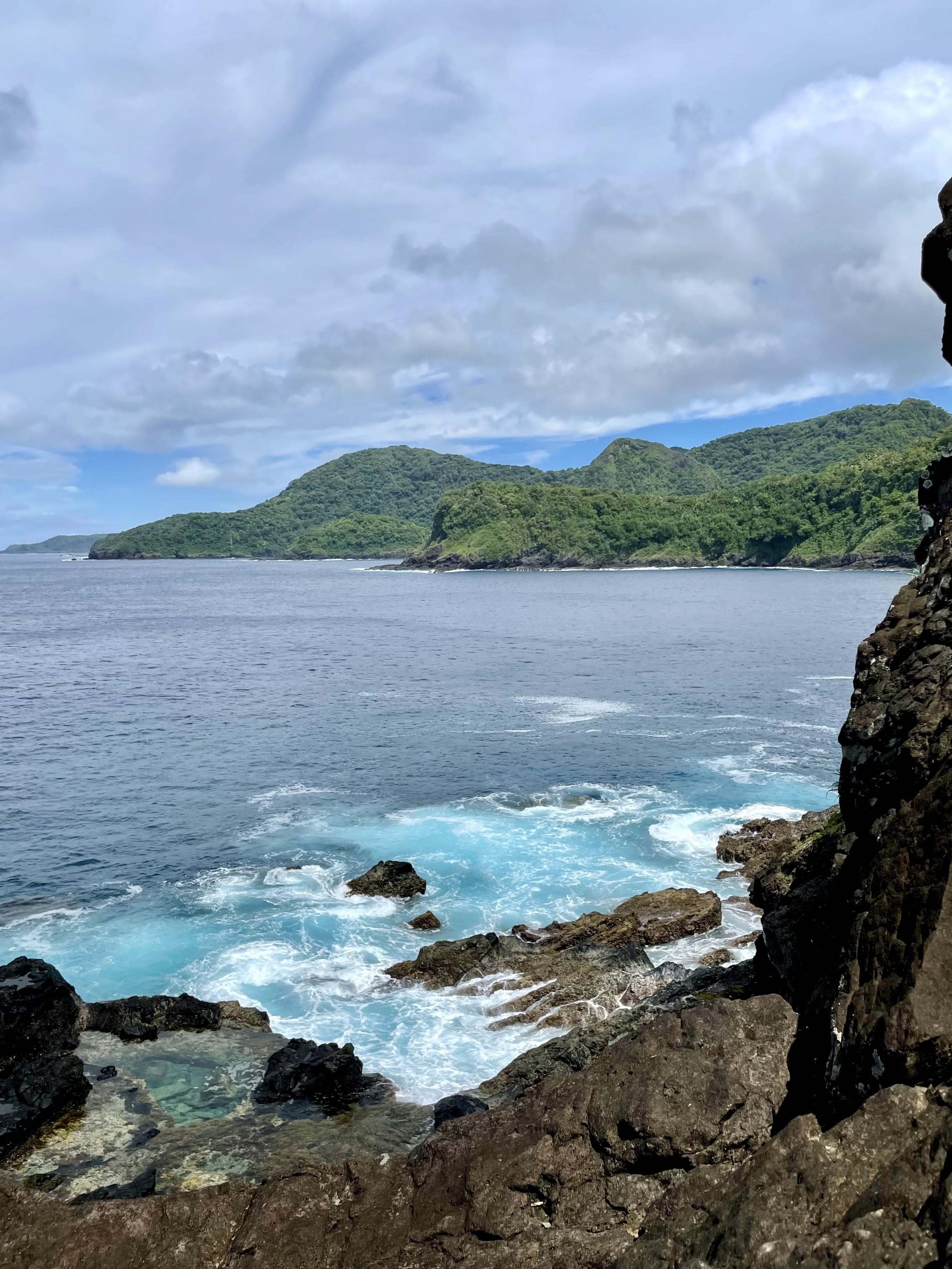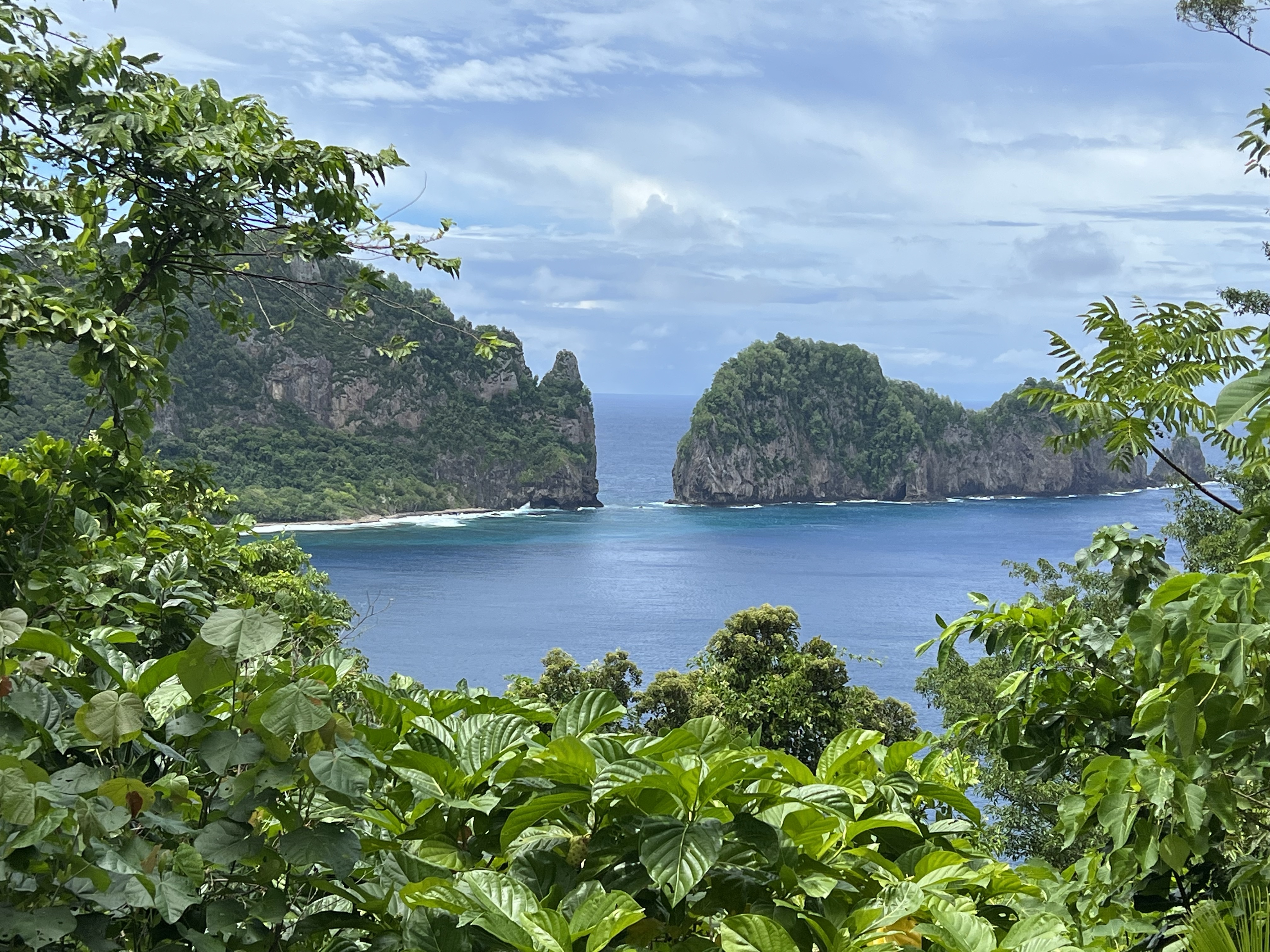 We left the visitor’s center with big smiles and happy hearts, ready to go exploring! First up was the scenic drive— honestly though, everywhere you drive on the island is scenic. We eventually made it to the top of one of the mountain passes, and ventured on our first hike. We started with the Lower Sauma Ridge Trail— rated as moderate, yet was short (less than 1 mile RT). This interpretive trail took us through a rainforest, and eventually lead to spectacular views of the northeast coastline of the island and the Vai’ava Strait National Natural Landmark.